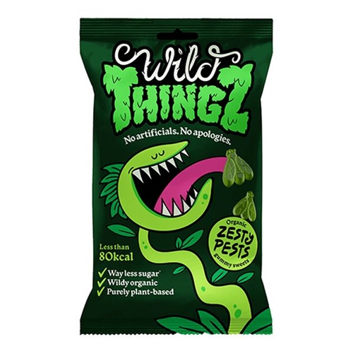Wild Thingz organic, plant-based gummy sweets. Half the sugar of the big brands. No artificials. No apologies.Our Zesty Pests contain a creepy-crawly mix of Green Apple flavoured Flies, Cherry flavoured Spiders, Lemon flavoured Maggots and Green Apple flavoured Vee the Venus Fly Trap.No artificial colours, flavours or preservatives. We use pectin’s from fruits to give them their soft jelly consistency (never gelatine).It's wild that sweets are so artificial. We're not gonna stand by sweetly. Less junk. More punk. Welcome to Wild Thingz. Join the wild side…. follow us at @wildthingz.co or look us up www.wildthingz.co"